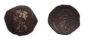 NUMISMATIC NOTES: Coins struck during this time were imitations, often careless ones, of earlier Byzantine issues. This one features an obverse (with the exaggerated jewels on the emperor's cloak) from an Alexios I coin, the reverse with the image of a beardless Christ apparently taken from a later issue of Manuel I. |