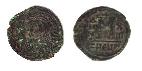 NUMISMATIC NOTES: More than a hundred years after the end of the iconoclast controversy, "anonymous" (i.e. without reference to issuing authority) bronze coinage with strictly religious images and messages is introduced - a practice that will last for about a hundred years to follow. Meanwhile - stylized, flat portraits gradually give way to more realism and beauty. |