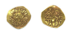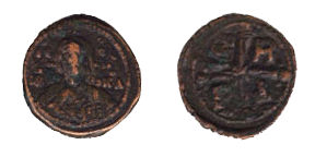 NUMISMATIC NOTES: Numismatic evidence can occasionally shed important light on historic events. In this case, a series of recently discovered hoards (hidden coin deposits) revealed a trail that implied a hitherto unknown incursion of Slavs over the Danube into the Byzantine Balkans, all the way to Thessaloniki and Thasos (northern Aegean), around 571. Iconographically, the image of two enthroned or standing facing figures (ruling pair or ruler and saint) will make a sustained appearance on Byzantine and other Mediterranean coinages for another 800 years, starting around this time. |